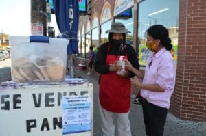 Carmen Camacho sells homemade Mexican-style bread in Chicago’s Little Village neighborhood. An information poster was placed in his cart to prevent the spread of COVID-19. Photo by Belhú Sanabria for La Raza and courtesy of The Chicago Community Trust