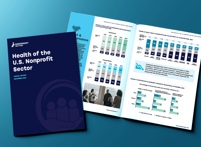 Independent Sector’s 2024 Health of the U.S. Nonprofit Sector: Annual Review, released in December 2024, provides data, analysis, and recommendations about the key areas powering more than 1.9 million U.S. nonprofits: economy and finances, workforce, trust and governance, and public policy advocacy. Drawing from a range of sector research and Independent Sector’s analysis, the report offers a high-level snapshot of the nonprofit sector today.