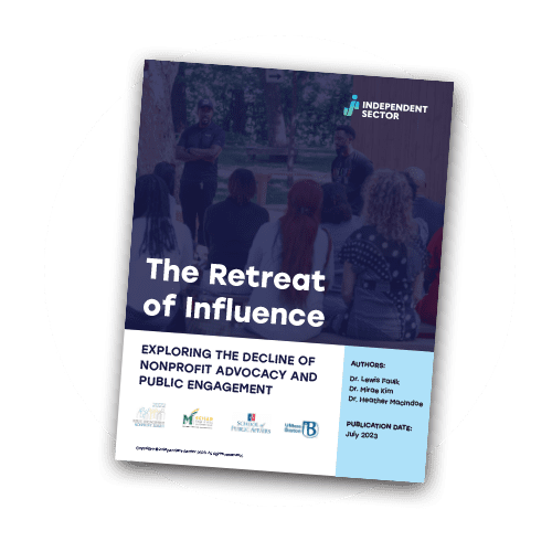 Independent Sector’s research provides an updated measurement of the status of a major pillar of nonprofit sector health: advocacy and civic engagement. In The Retreat of Influence: Exploring the Decline of Nonprofit Advocacy and Public Engagement, we share the results of our nationally representative survey and provide insights on how advocacy and civic engagement vary by organization size, geography, communities served, and leadership demographics.