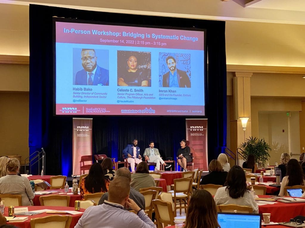 I was honored to host an in-person workshop, “Bridging Is Systemic Change,” sharing why bridging differences is key to how we work at IS, and why we launched our Bridging Fellows program. Participants also had the good fortune of hearing directly from two of our Fellows – Imran Khan, CEO and co-founder of Embarc, and Celeste C. Smith, co-founder, 1HoodMedia and Senior Program Officer at The Pittsburgh Foundation – about how they are implementing bridging to advance understanding and create change in and through their mission work.