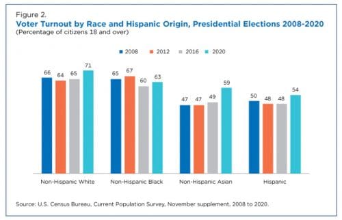 They also point to the 2020 election in which Black, Latino, and Asian voters had higher rates of participation, compared to 2016, something the U.S. Census Bureau reported in late April. Native American voters also had high rates of participation in 2020, according to community organizations and news reports.