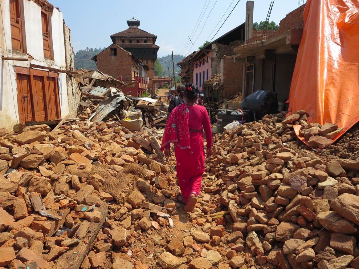 Just a few days after the rst earthquake, a local woman walks across debris in the Nuwakot Durbar.