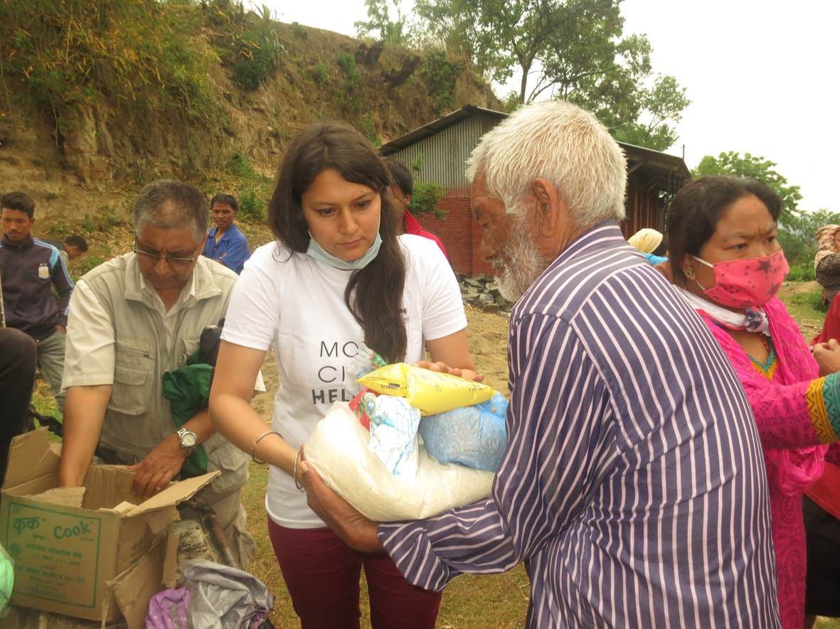 Volunteer Kshitiz dis- tributes relief materials to earthquake victims in Duku Chhap. Many citizens have indicated that relief agencies drop o aid without assessing needs properly but that the Accountability Lab’s volunteers ‘really listen to our problems.’